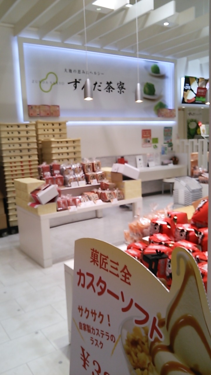 「萩の月」でおなじみの宮城の有名お菓子メーカーのお店なのですが、お菓子の販売の他に店内のイートインスペースで「ずんだシェイク」や「カスターソフト」などのスイーツも味わうことができ、お土産探しや小休止に重宝しました。
