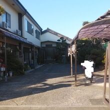 細い道沿いに多くの寺院が建っているのが特徴的な街並み。ここはお寺らしい道具類が境内に見られ、表札からもお寺だと読み取れたが、雰囲気は普通の住居のようなたたずまいだった。