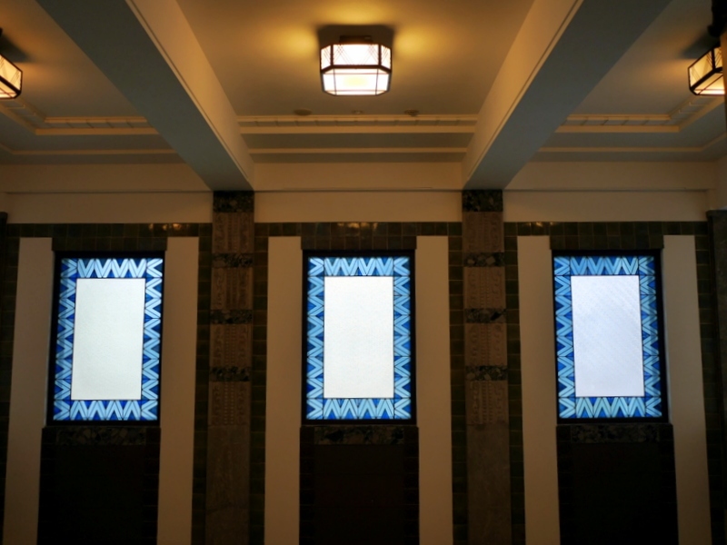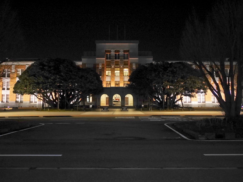 旧石川県庁、夜にはライトアップもされる美しい建物。1924年竣工で矢橋賢吉の設計。県庁移転後はリノベーションにより、表は昔の外観を残すが、金沢城址側を全面ガラス張りとしており、中に入ると斬新で驚く。古くからあるステンドグラスも見事で、これらは建設当初のもの。