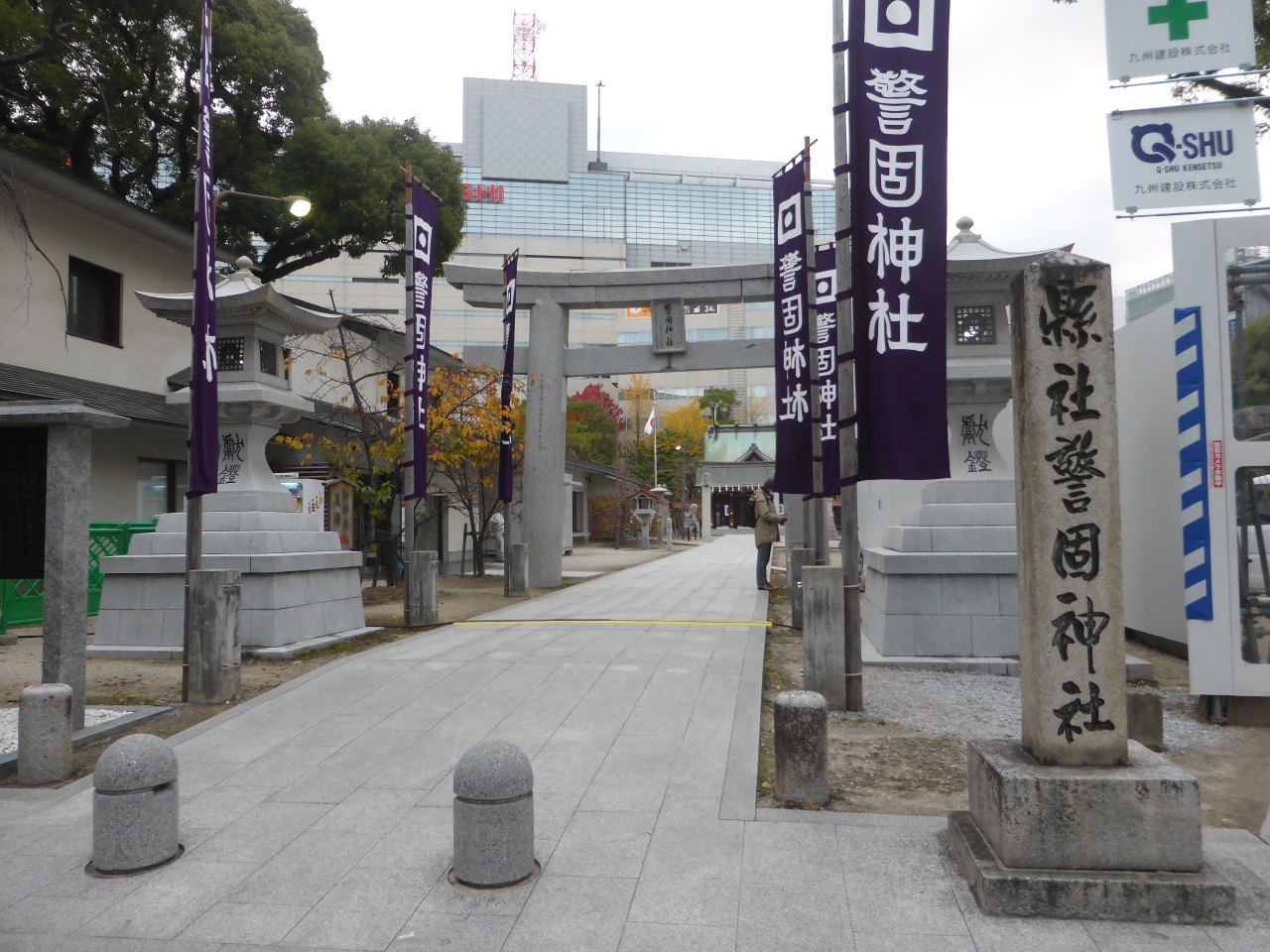 福岡市の繁華街天神のど真ん中にある警固神社。周りには福岡三越やソラリアプラザ、ビックカメラなどデパートや商業施設に囲まれとても賑やかなところです。境内に入ると一変、静かで落ち着いた雰囲が漂っています。スーツを着たサラリーマン風の人が通りすがりにお参りしていました。、都会にありながら、地元の人にも愛されている神社。
