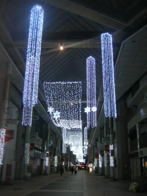 予想通り、深夜11時過ぎと、本来の繁華街としてはこれからという時間帯だったのにも拘わらず、営業店舗も少なくひっそりとした風情でしたが、逆にアーケードのイルミネーションなどを人波に遮られることなく、悠々と撮れる良さもありました。、