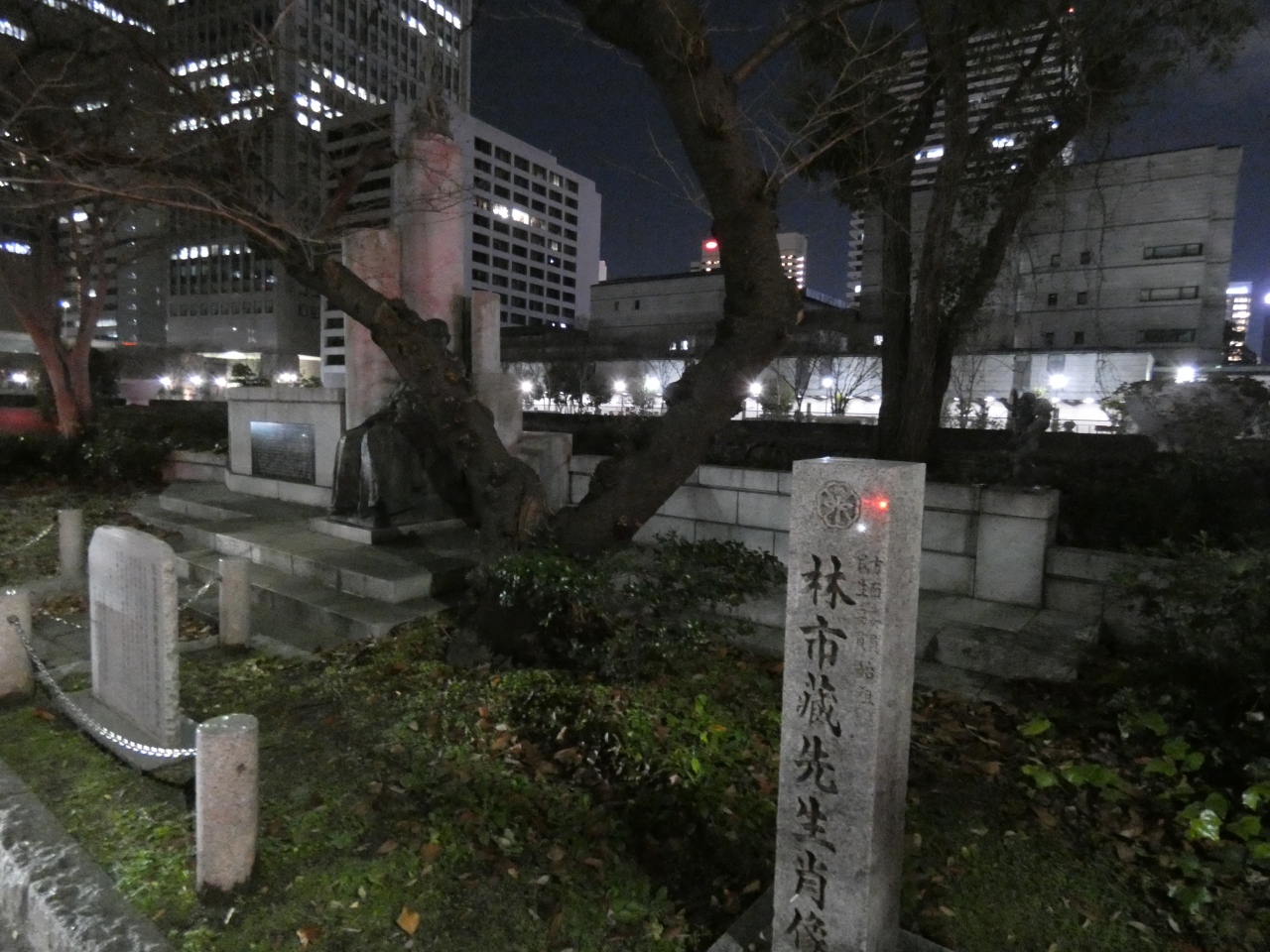 海遊館ツアーの後、中之島イルミネーションを見に行く途中、土佐堀川の南側を歩いていると見つけた銅像と石碑。元大阪府知事の林市蔵の功績を讃えて造られた記念像です。現在の民生委員制度の基礎を作った人だそうで、「民生の父」と呼ばれているようです。