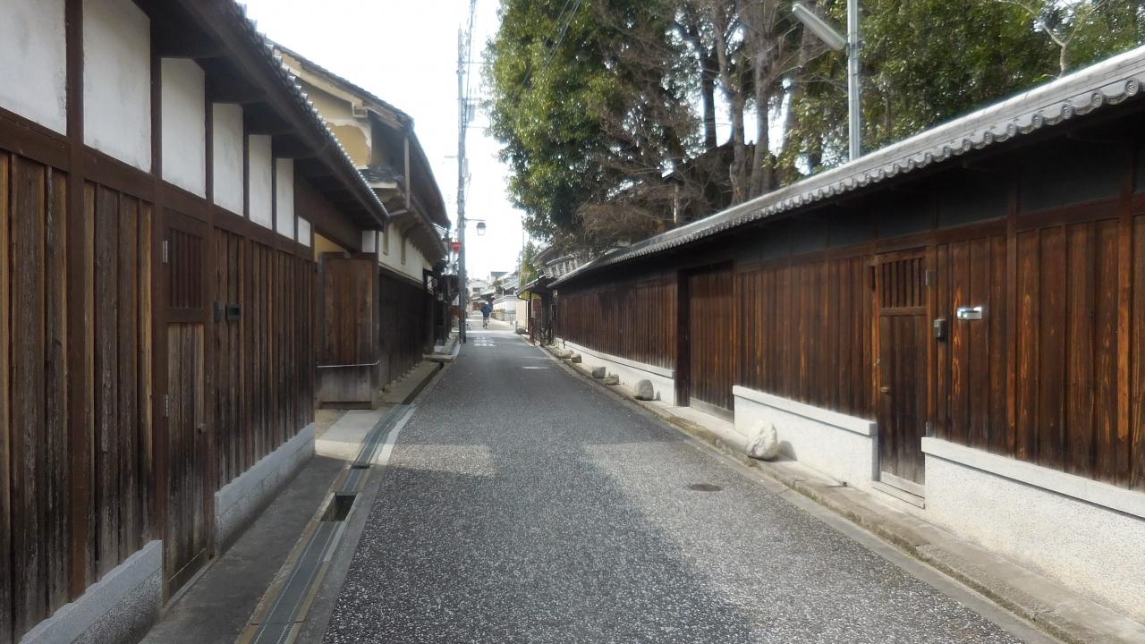 じないまち展望広場から寺内町センターに至る富田林町の一画には、仲村家住宅を始め、橋本家、木口家、上野家といった重厚な町家が多く残っている。建物はいずれも一階部分は茶色の板塀に格子窓、2階部分は白壁に虫篭窓、築地塀から大きく育った木々が見え、まるで時代劇のセットを見るようである。人通りも少なく散策には最高の場所。
