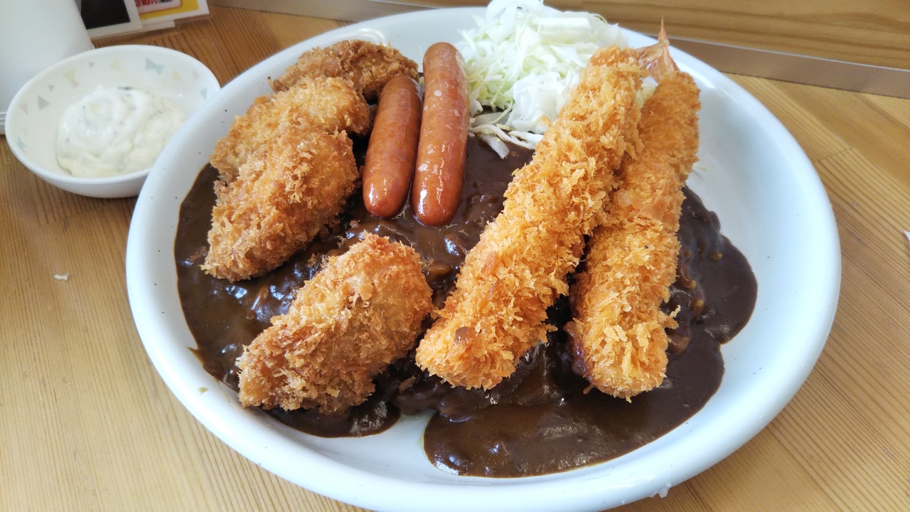カキフライカレーにエビフライ2本とソーセージ2本のトッピングをしたものをオーダー。