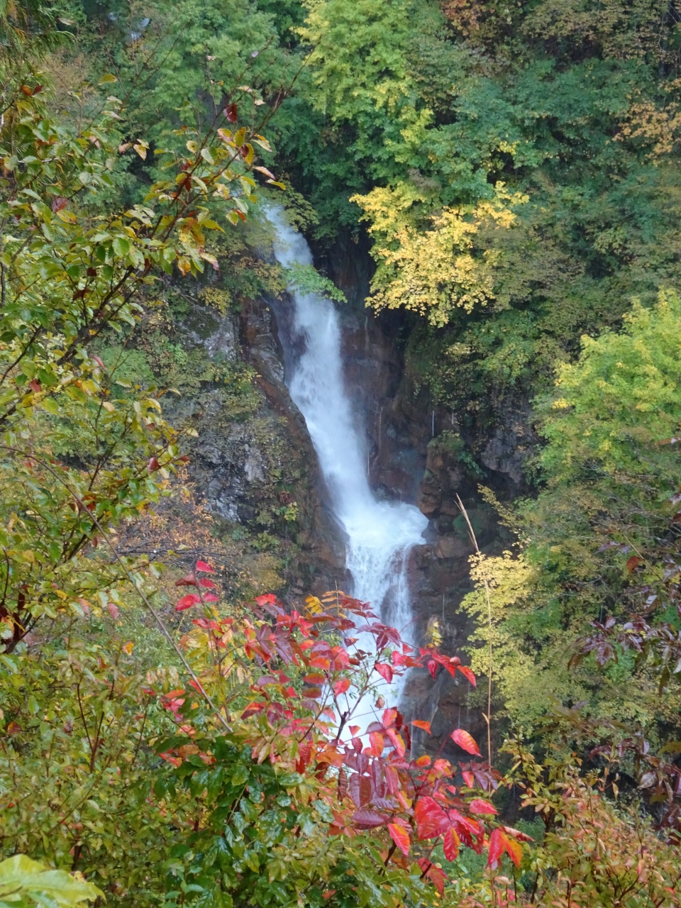 遠くに見える小さな滝ですが、紅葉した木々の間、岩肌から水が流れ落ちる様子は優雅で綺麗でした。