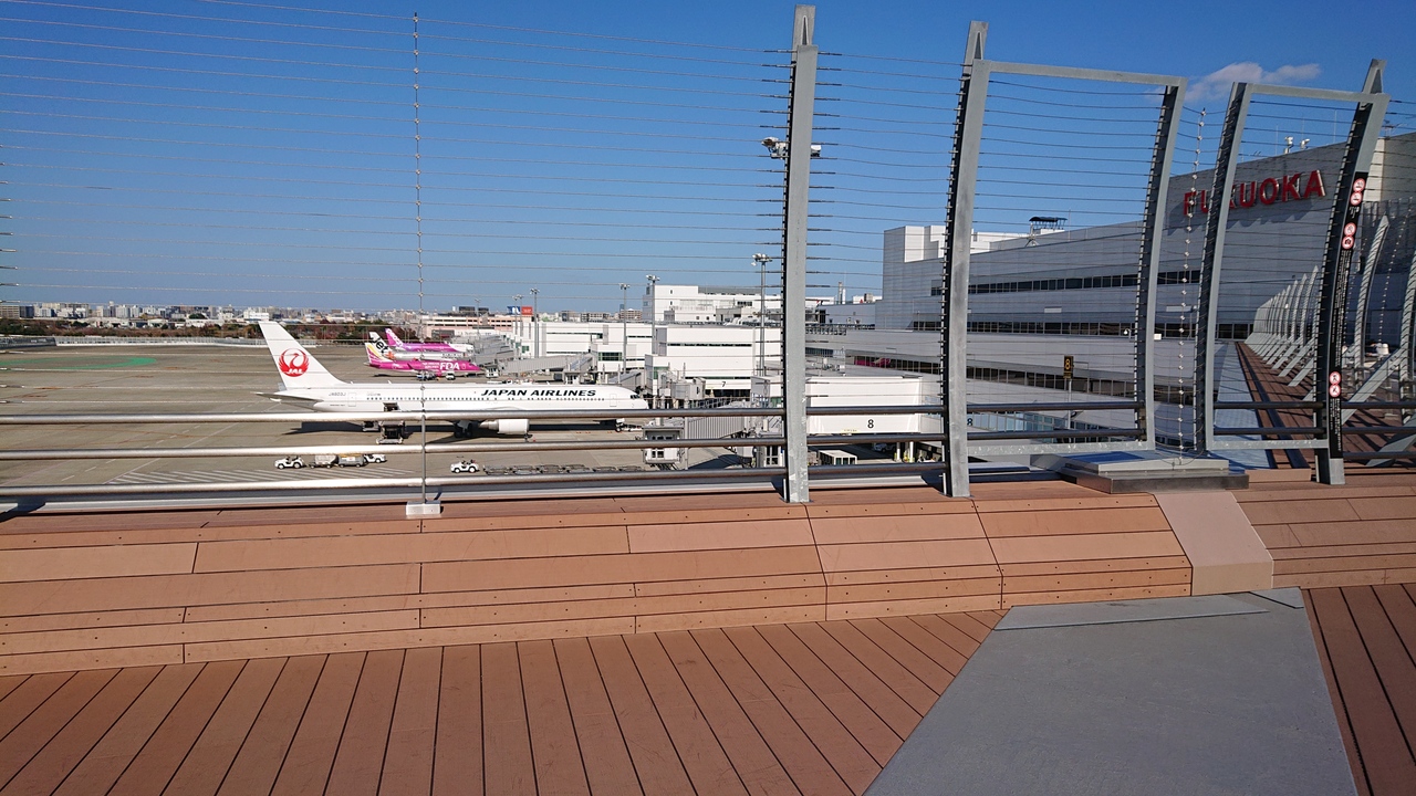 福岡空港の国内線ターミナルビルに設けられている、展望スペースです。11月下旬の平日午前中の時間帯に訪問しました。吹きっさらしですので、少々寒かったですが、その分解放感がありました。たくさんの飛行機が並んでいる様は壮観で、楽しかったです。
