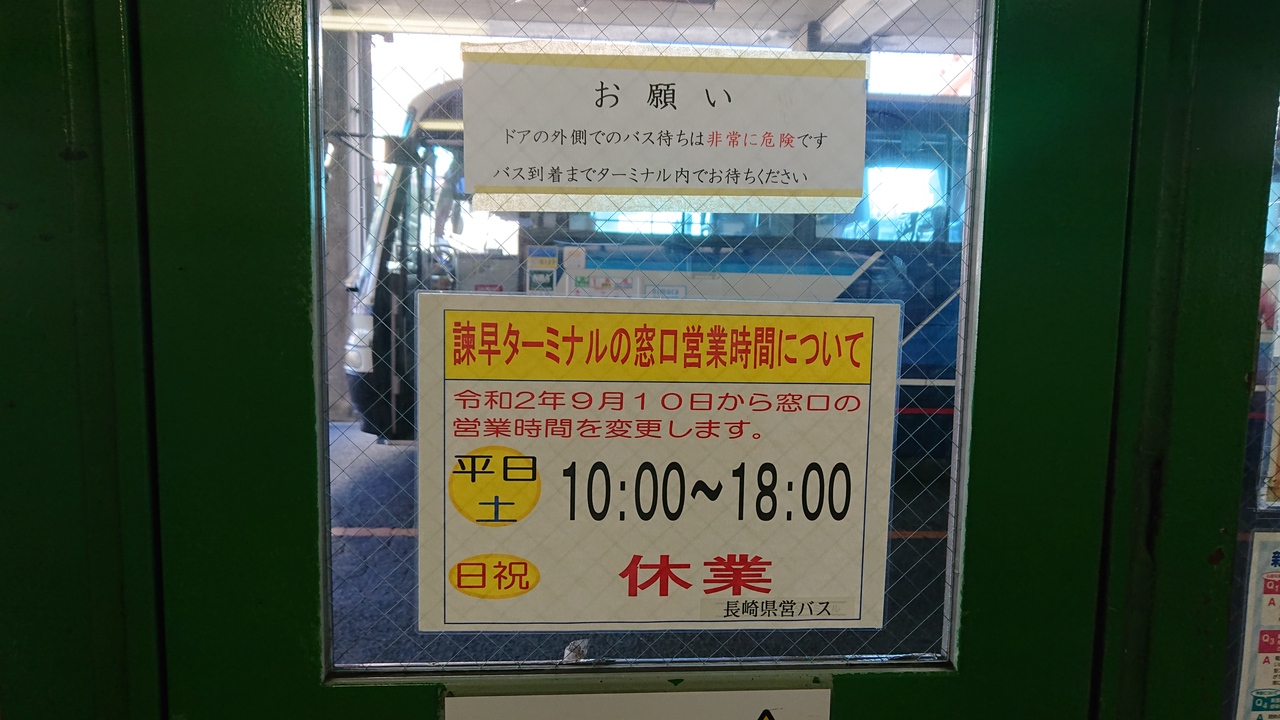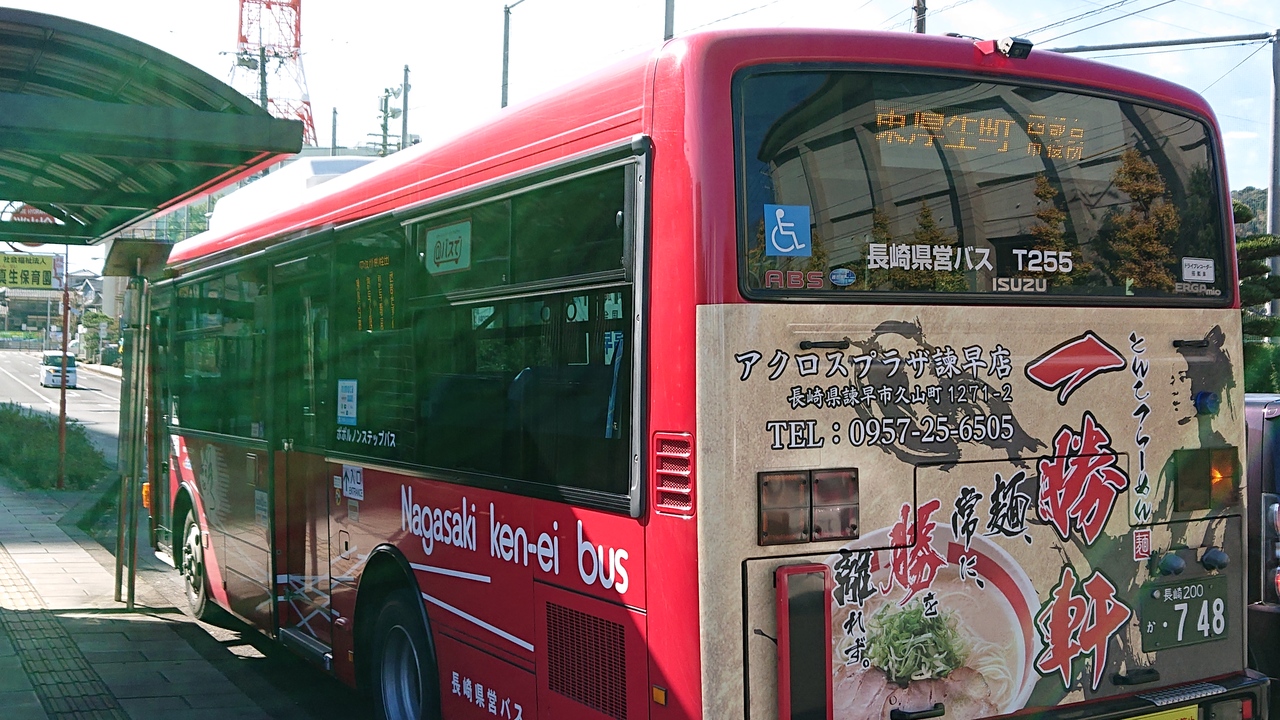 11月下旬の休日の午前11時台に、諫早駅前バス停から、市役所前バス停までの区間を乗車しました。乗車した諫早駅前バス停は、バスターミナルとなっており、古い施設ではありますが、寒さがしのげてありがたかったです。車両は、一般的な大型バスでした。