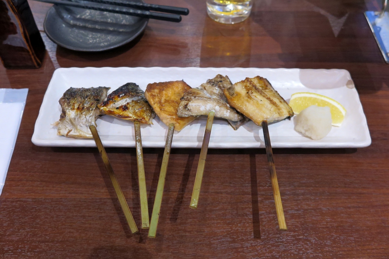 - 「魚串」おまかせ五種盛」1080円、いろいろ食べられるのは良いけれど、お頭付きを2尾食べたかったかも…
