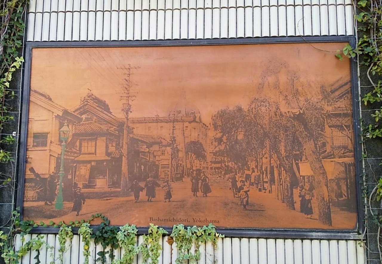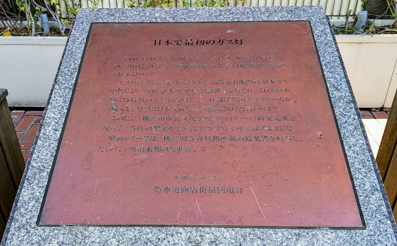 案内板によると明治5年に馬車道に日本で最初のガス灯が設置、点灯されたそうで、「関内ホール」の新築完成(昭和61年)記念に 2基のガス灯のレプリカと明治末期の馬車道風景の写真を転写したレリーフがつくられたとのこと。