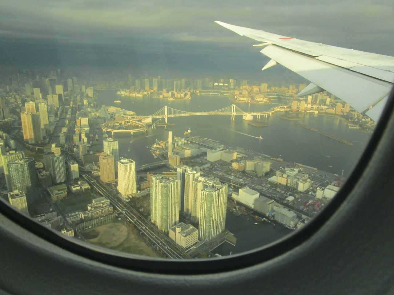 羽田空港着陸時の新飛行ルートで上空からレインボーブリッジを見ることができました。