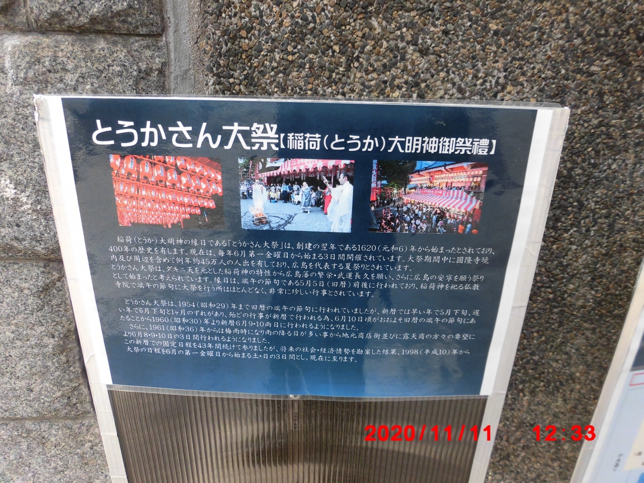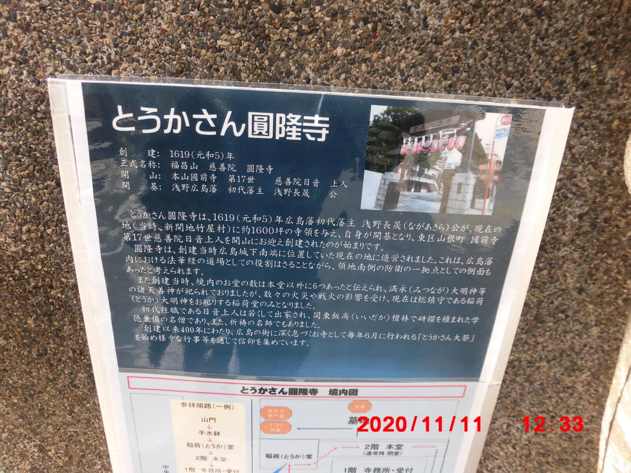 広島市観光で立ち寄りました。とうかさん圓隆寺は、1619年広島藩初代藩主がこの場所に1600坪の寺領を与えたことから始まっています。藩主自らが開基となって國前寺の慈善院日音上人を開山にお迎えして創建されたそうです。お堂の数も本堂以外に6つもある大きなお寺だったそうですが、現在は総鎮守の稲荷(とうか)大明神をお祀りする稲荷堂のみが残っているだけとのことでした。