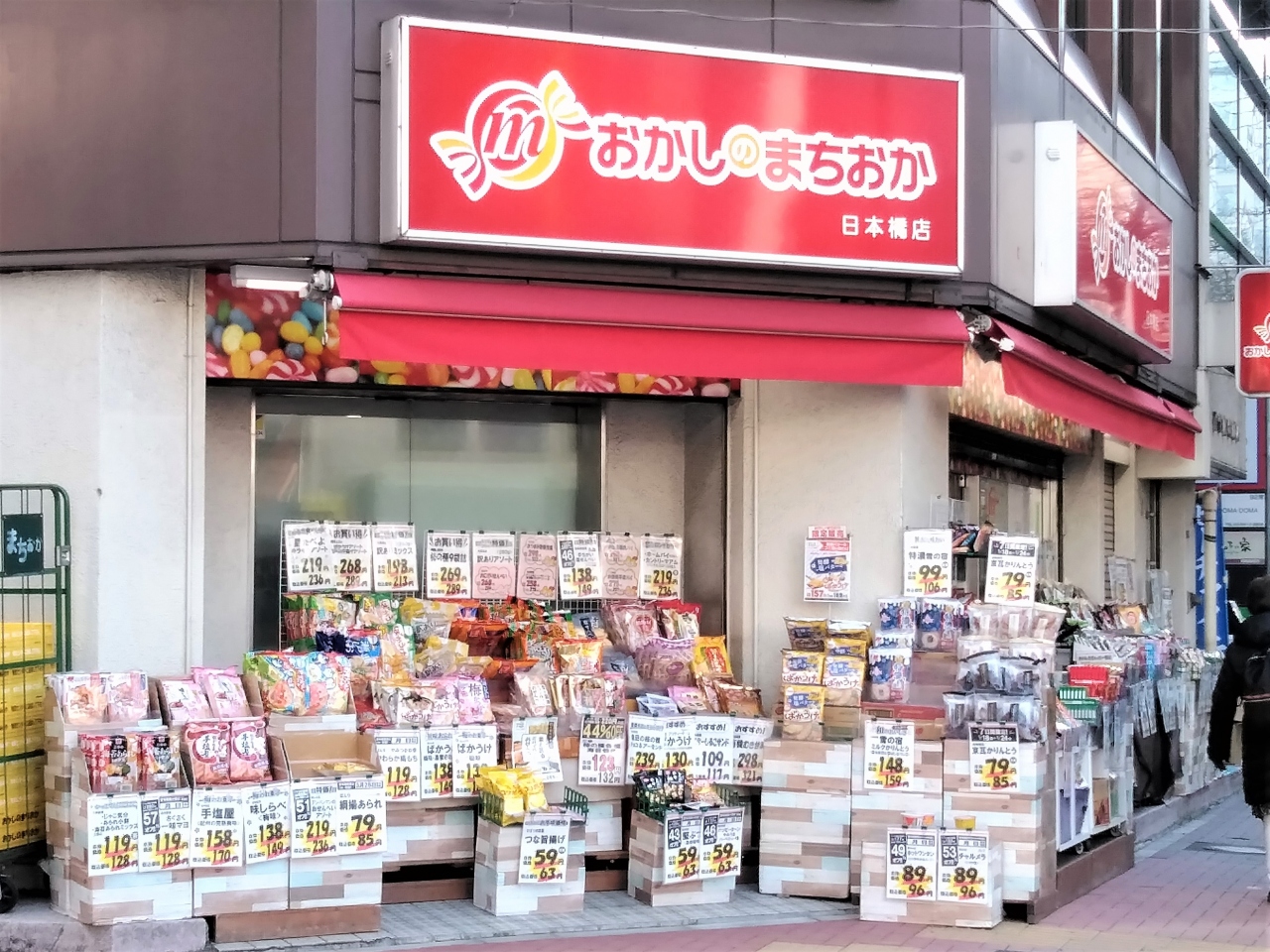 1つ目の信号のある交差点の角の「おかしのまちおか」はお菓子がとても安いです。