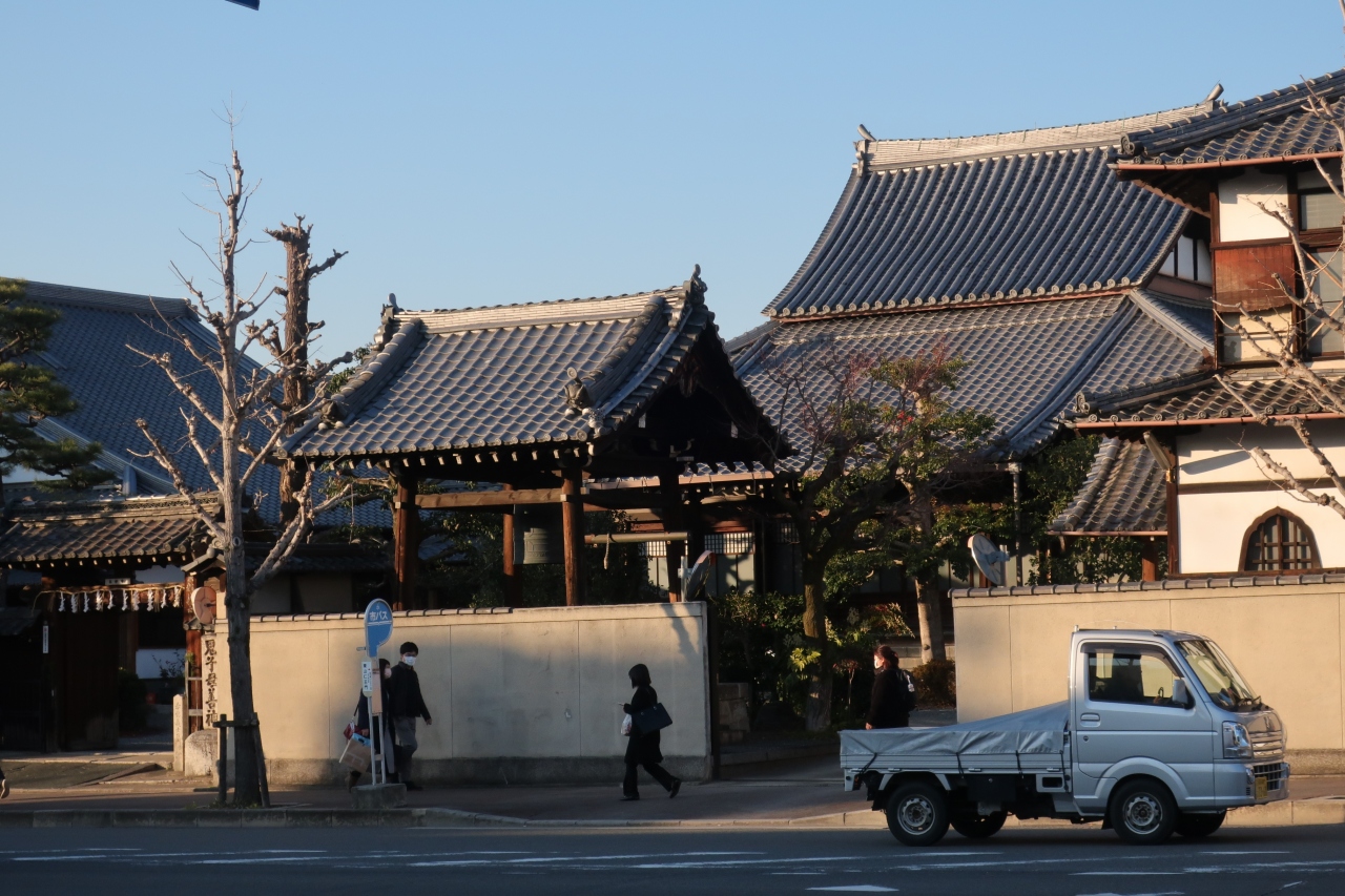 地下鉄三条京阪駅から京都伝統産業ミュージアムへ向かう途中に立ち寄った日蓮宗のお寺だ。通称で赤穂義士の寺とある。赤穂四十七士の中心人物の一人として活躍した吉田忠左衛門と息子、実弟ら三人の義士の墓がある。赤穂義士と言えば東京・泉岳寺だが、忠左衛門の弟がこの寺を菩提寺と決めていた縁で墓碑があるという。日蓮宗のお寺はいずれもそうだが、ここも大ぶりな構えだ。