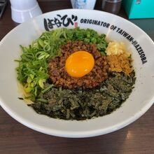 普通のラーメンもありましたが、やはり混ぜそばを注文。ネギ、海苔、挽肉、玉子が麺が見えなくなるまでトッピングされています。