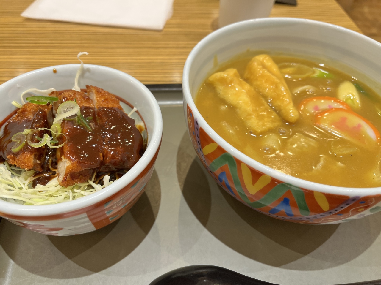 カレーうどんと味噌カツセットを食べました。味噌カツはロース、脂身が多く硬くて好みではありませんでしたがカレーは名物なだけあって美味かったです。普通のうどん屋のしょうゆベースだとお一発でわかる味ではなくスパイシーだけれどマイルド感がありました。