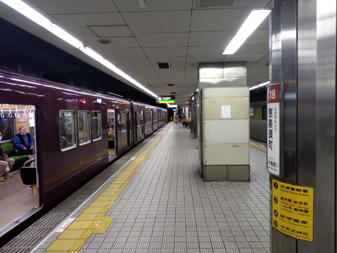 ミナミ近辺から通天閣へ向かう際、日本橋(にっぽんばし)から恵美須町まで1駅利用ました。阪急電鉄千里線・京都本線と相互直通運転を行っているので阪急の車両も走っています。ラインカラーも阪急に合わせての茶色というのも特徴です。