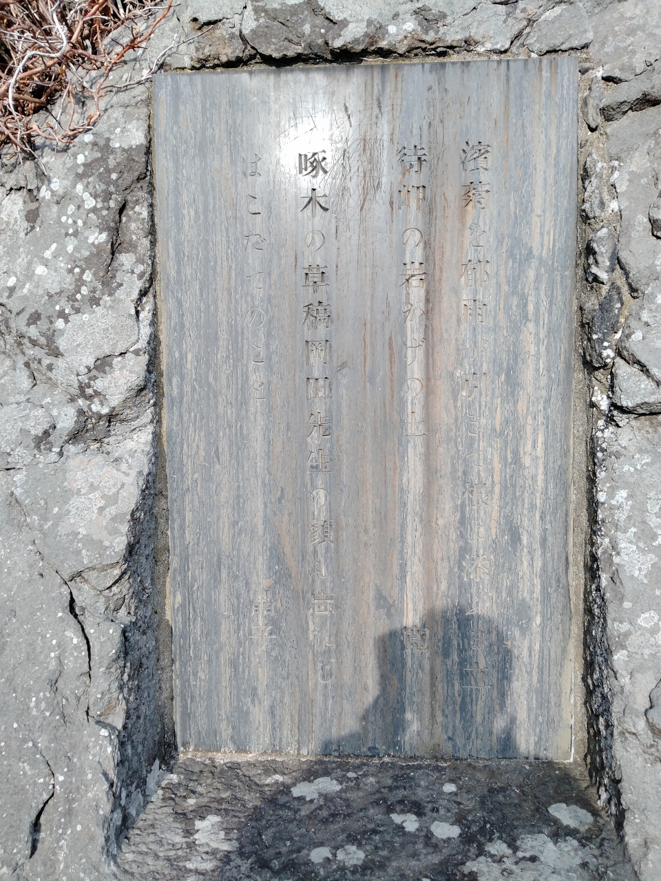 昭和6年6月6日啄木の墓参りに訪れた際に詠んだ歌を刻んだもので、「浜菊を郁雨が引きて根に添ふる立待岬の岩かげの土 寛」 「啄木の草稿岡田先生の顔も忘れじはこだてのこと 晶子」 とありました。