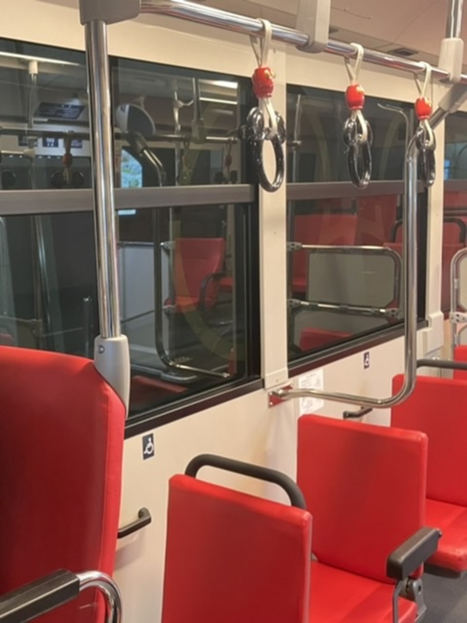内装の座席がミッキーマウスの赤と黒の洋服のようになっており、吊り革もミッキーの形をしていました。運転手の方もとても親切なので安心です。