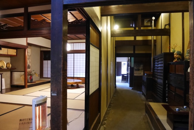 無料で見学のできる家。間口は狭く、奥行きのなが〜いおうちです。奥の方には蔵があり、蔵のなかもあがって見学することができます。なにげに欄間があまり関西では見かけないパターンをしているなと感じ、興味を惹かれました。近世(江戸以降)に使われていた古い道具などの展示もあります。