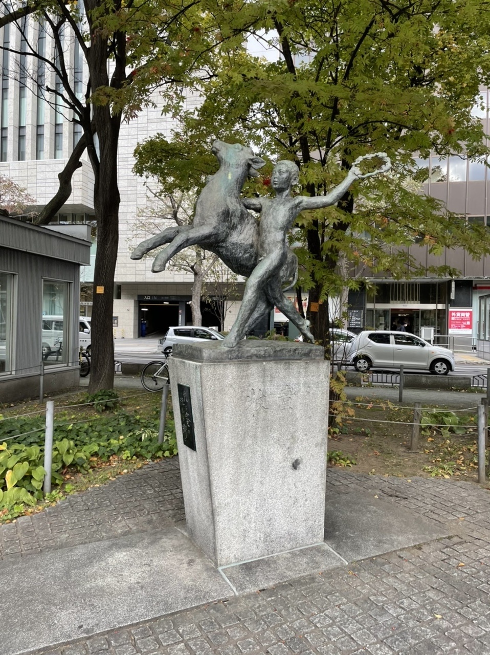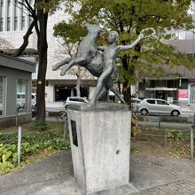 大通公園の西3丁目エリアにあります。大通公園に終戦後初めて建てられた彫刻です。牧童と仔牛が仲良く理想郷に向かって走る姿が表現されています。大通公園には、他にもたくさんのモニュメントが設置されていました。