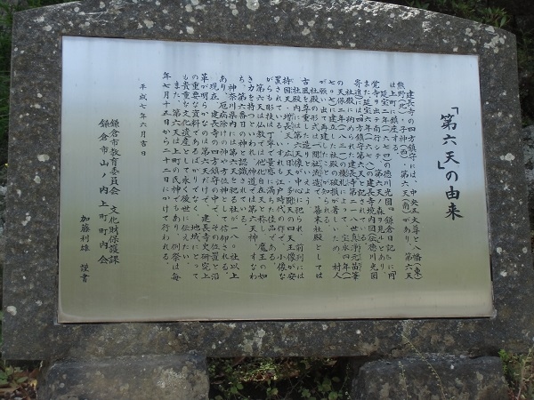 説明板によると、建長寺の四方鎮守には、中央五大尊と八幡(東)・熊野(北)・子神(西)・第六天(南)があり、第六天は上町に鎮座します。