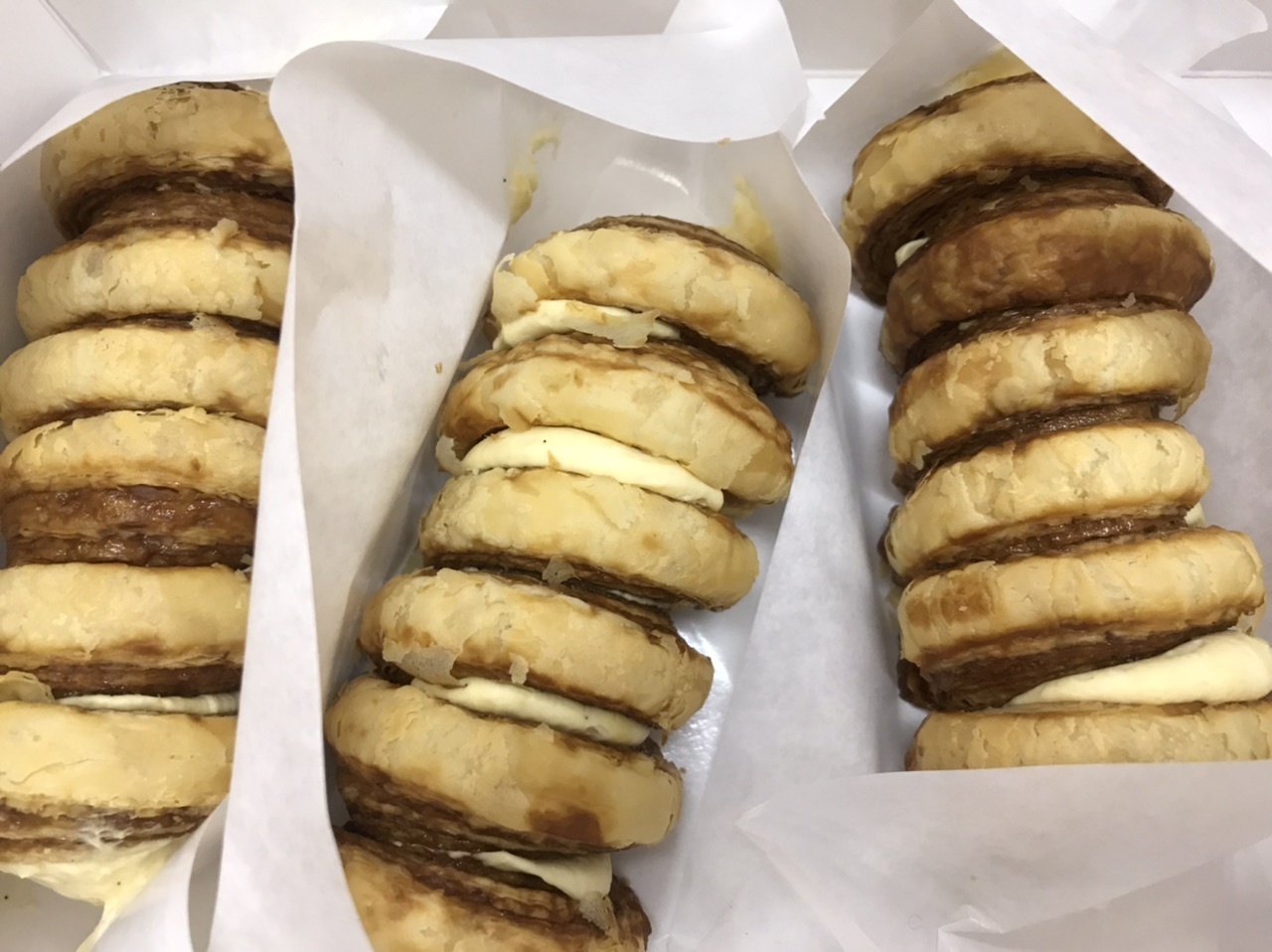 いつも行列ができているお店。京都たまき亭の監修。形はまさにコロネ。それがクロワッサン、もしくはパイ生地でできていて、さらにクイニーアマンのようなトッピングがされていると思うと近いものが想像できる。そのものを味わいたいならプレーンがおすすめ。
