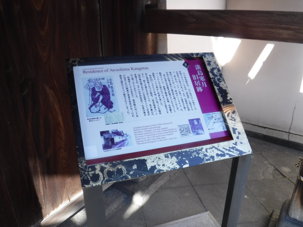 この淡島寒月の旧住居跡を示す看板は、その七福神のひとつでもある布袋様をまつった弘福寺の前にある。