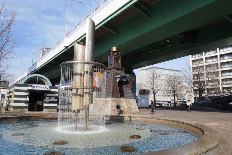 せっかくのからくり時計なのに、高速道路の下(=騒音が大きい)というなんとも残念な場所にあります。もしかしたら、この時計のほうが高速道路より先にできたのでしょうか。この一帯は栄方面より引き続きで(完全に続いているわけではないが)公園となっており、時計のすぐ近くには噴水もあり、ひと昔前はいまよりもっと都会のオアシス的存在だったのであろうことがしのばれます。