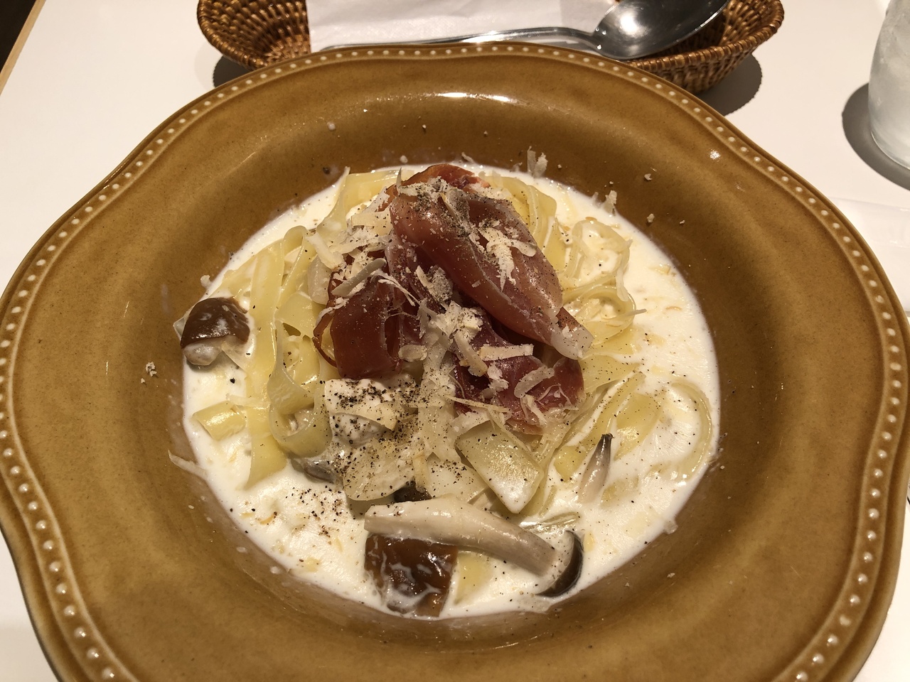 平日昼の利用でしたがそれほど混雑なく落ち着いてました。パスタのランチセット+タルトを注文しました。クリーム系の生ハムとポルチーニのパスタが美味しかったです。クリーム系は平たいフィットチーネの麺によく合います。タルトはかなり大きいので食べ応えありで大満足でした。