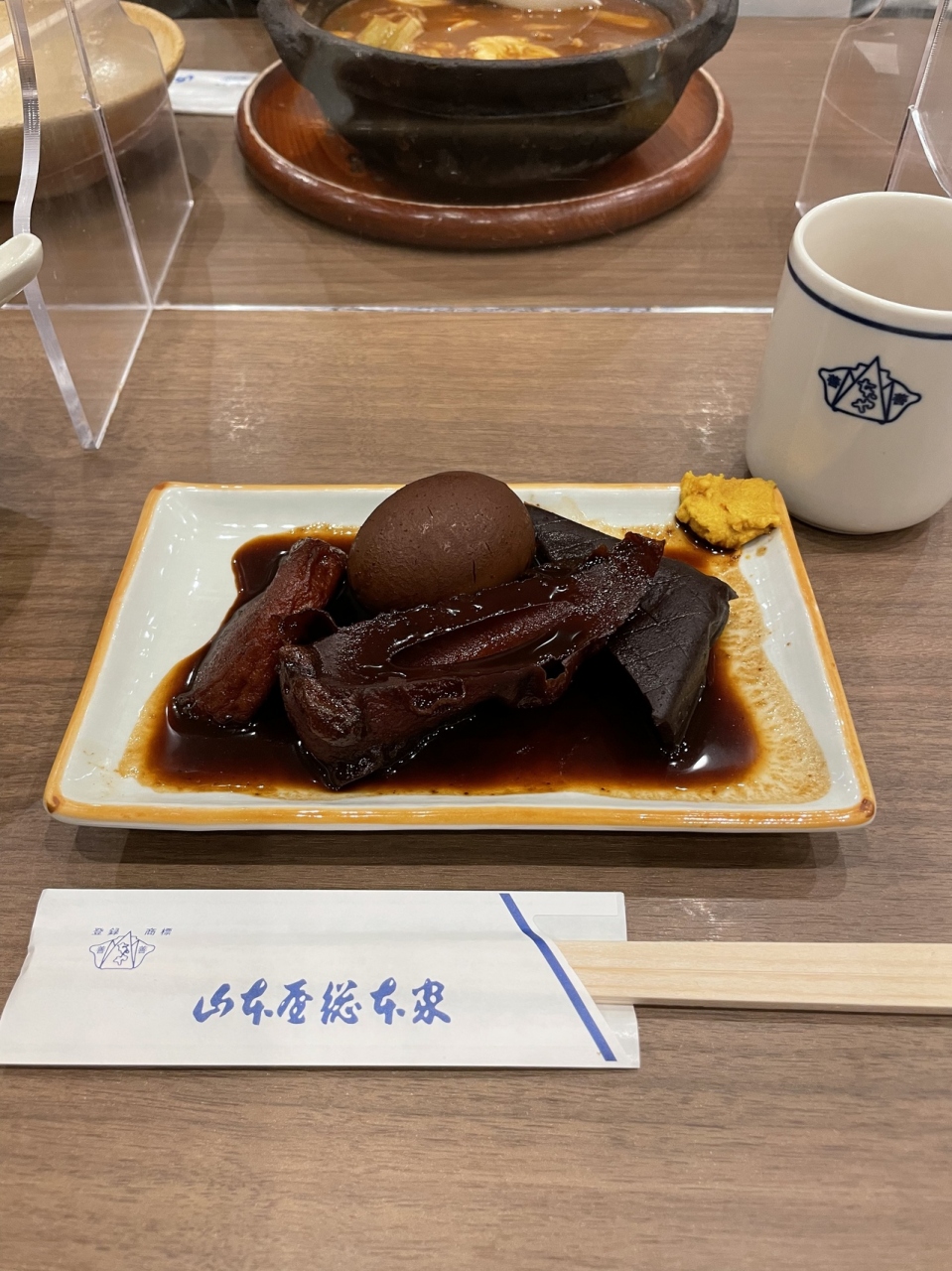 もう一品で頼んだ、おでんが味噌味で真っ黒でびっくり!でも味が染みてて美味しかったー!