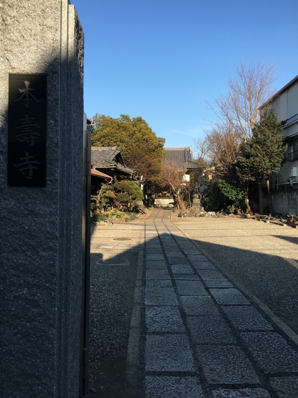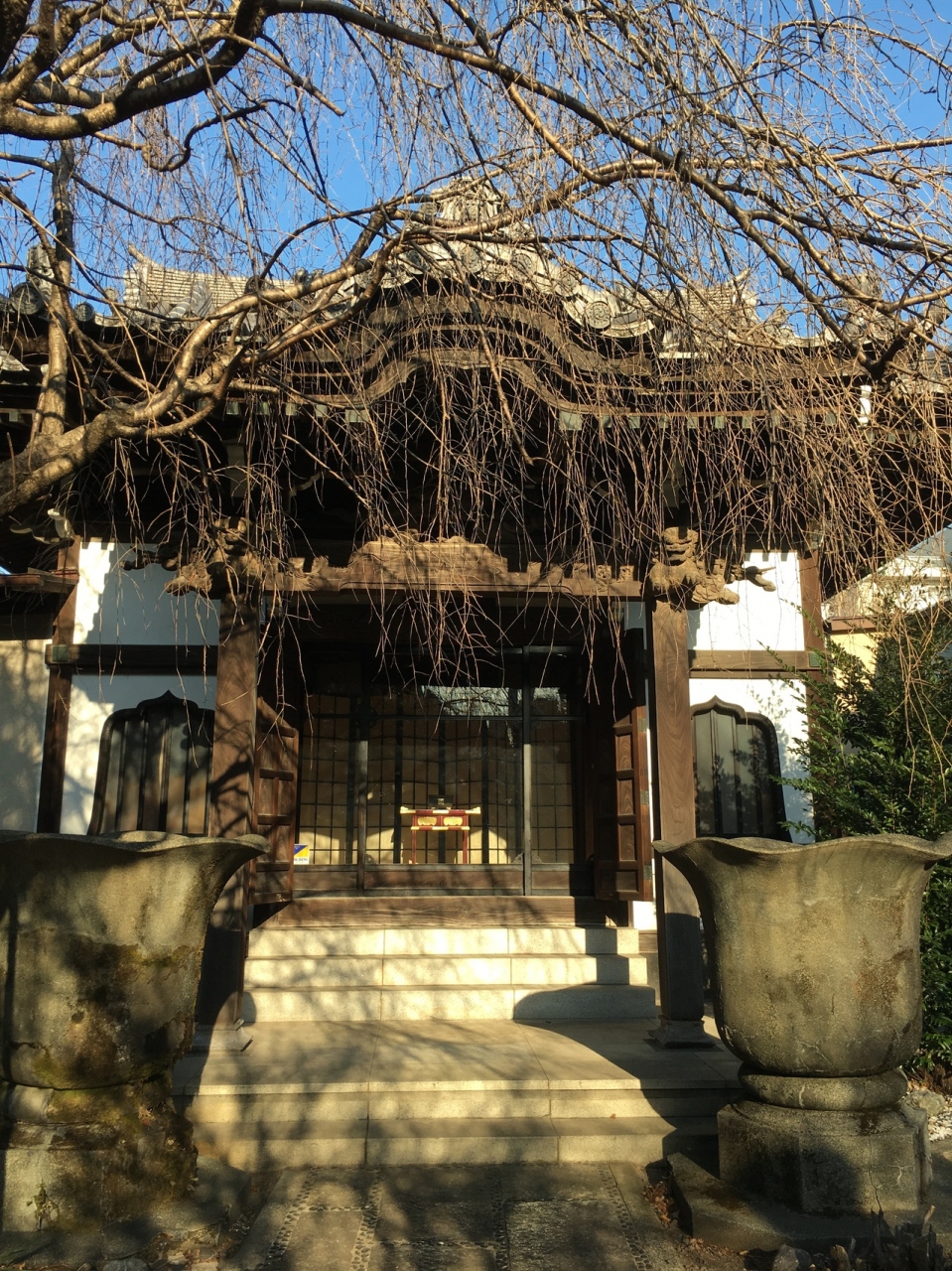 門が石の柱で境内の前は砂利の空間になっていました。石で囲った小さな池がありましたが魚は見当たらなかったです。本堂の前の木の枝が本堂の前に垂れ下がり、葉がなかったので寂しく感じられました。手前には大きな桶が2つあります。