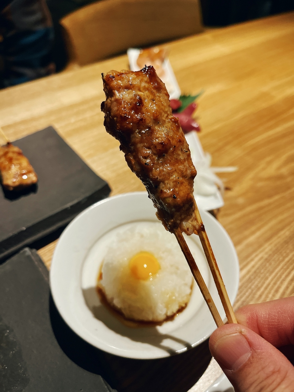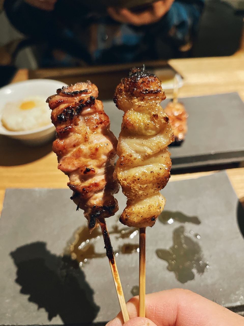 焼鳥串はこだわりの部位「みさき」「えんがわ」「ちょうちん」から内臓系「肝」「ズリ」「ハツ」などどれも焼きは完璧!表面はパリッっと中はふっくらジューシーな仕上げで美味しい☆塩加減もタレ焼きの「タレ」もいい塩梅〜途中で挟む焼き野菜「大和芋」「ミニ玉ねぎ」の焼き加減も最高で焼きの腕前が素晴らしいのがわかります!それと箸休めの「鬼卸とうずら卵」がイイね〜福岡には無いスタイルです。