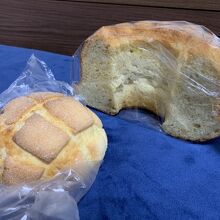 今回は、サツマイモのクグロフ(ハーフ)と、メロンパンを購入。 驚いたのはメロンパンです。 トングで掴んだ瞬間、めっちゃ固くて、私の苦手なタイプのメロンパンだったか?!と一瞬思いましたけど、試しに買ってみたのですが、ザクザクのメロンパンの皮の中は、本当にモチモチのパンで本当に美味しかったです! 店主によると、ご飯が入っているらしい! 米粉は小麦粉よりもモチモチと聞きますが、米粉ではなくご飯とは! 斬新なアイディアからこんな美味しいパンが出来るんだなーと感動。