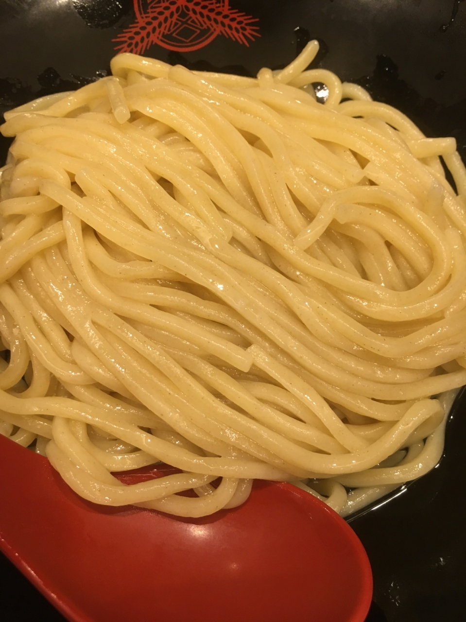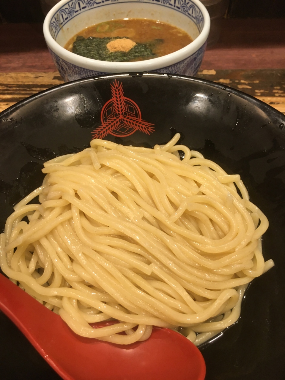 店員さんには味噌つけ麺をすすめられましたが、普通のつけ麺を注文。太麺のため出てくるまで10分以上掛かりました。つやがある麺で、スープは濃いめで、メンマ、チャーシューも旨かったです。スープを飲んだ瞬間に魚介類の味がしました。