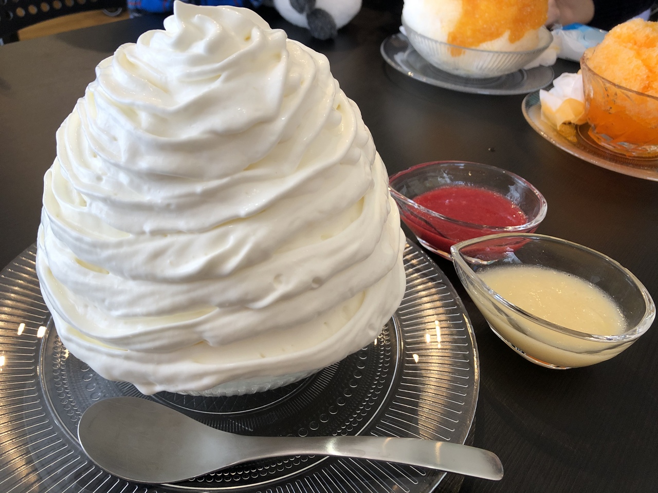 いちごと白桃ソースが別添えで付いていて味変もできるため大きくても飽きません。