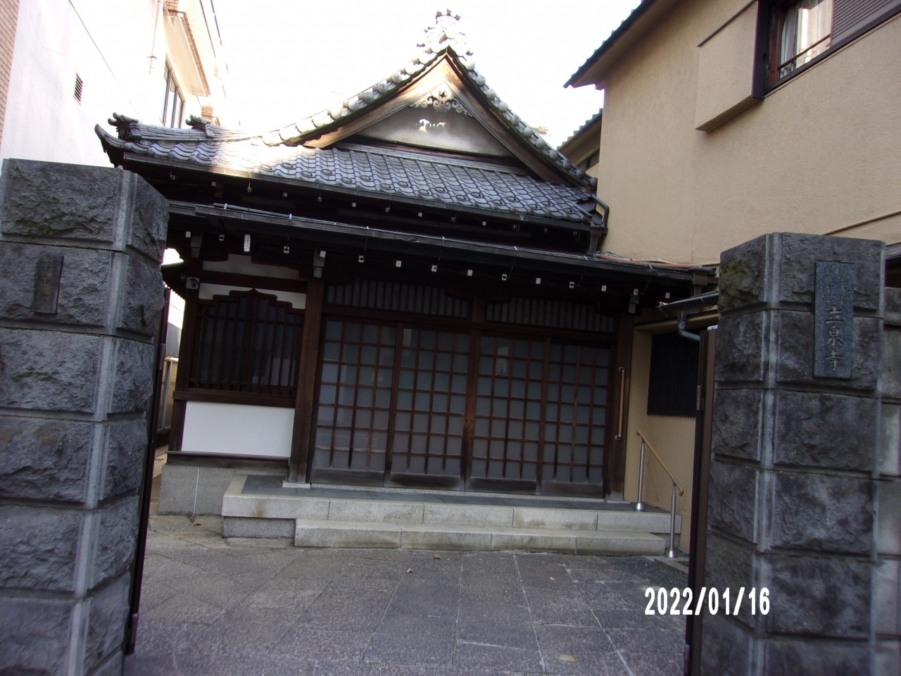 この立泉寺は青山キラー通りの坂上近くにあります。地下鉄銀座線外苑前駅からは5分程度の場所にあります。この寺は浄土真宗本願寺派のものです。17世紀前半に麻布で創建されて明治の時代に今の場所に移築しています。門の奥に本堂があります。民家のような印象です。本堂以外には簡素なのです。
