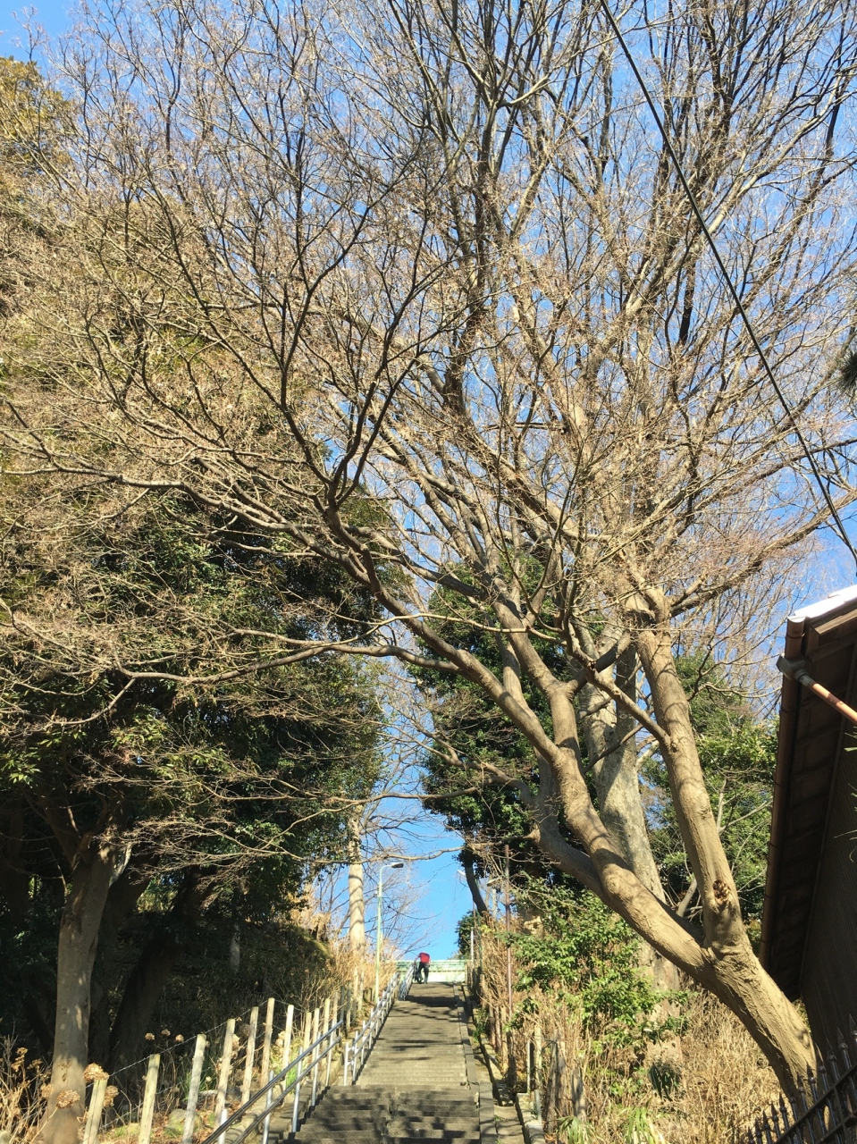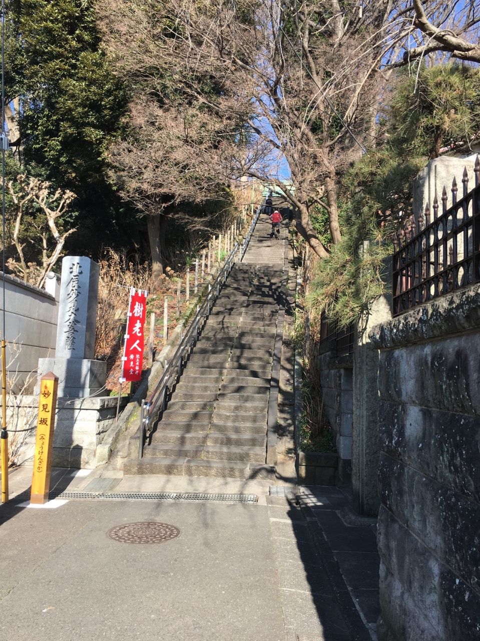 少し急な魚でしたが下から上がると徒歩2~3分で上がることが出来ます。坂と言っても階段の道で左側にはには手摺があり、左右は木々が茂っていました。階段の真ん中あたりにほんの少し広いエリアがあり、登りきると妙見堂があります。