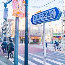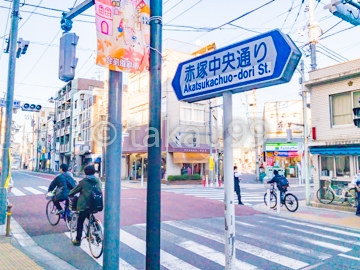 「赤塚中央通り」は東武東上線の下赤塚駅付近から北にのびる道路です。両側に歩道が整備されていて比較的歩きやすいです。下赤塚駅付近は歩行者や自転車の往来が結構あります。商店などがそれなりに建ち並んでいます。