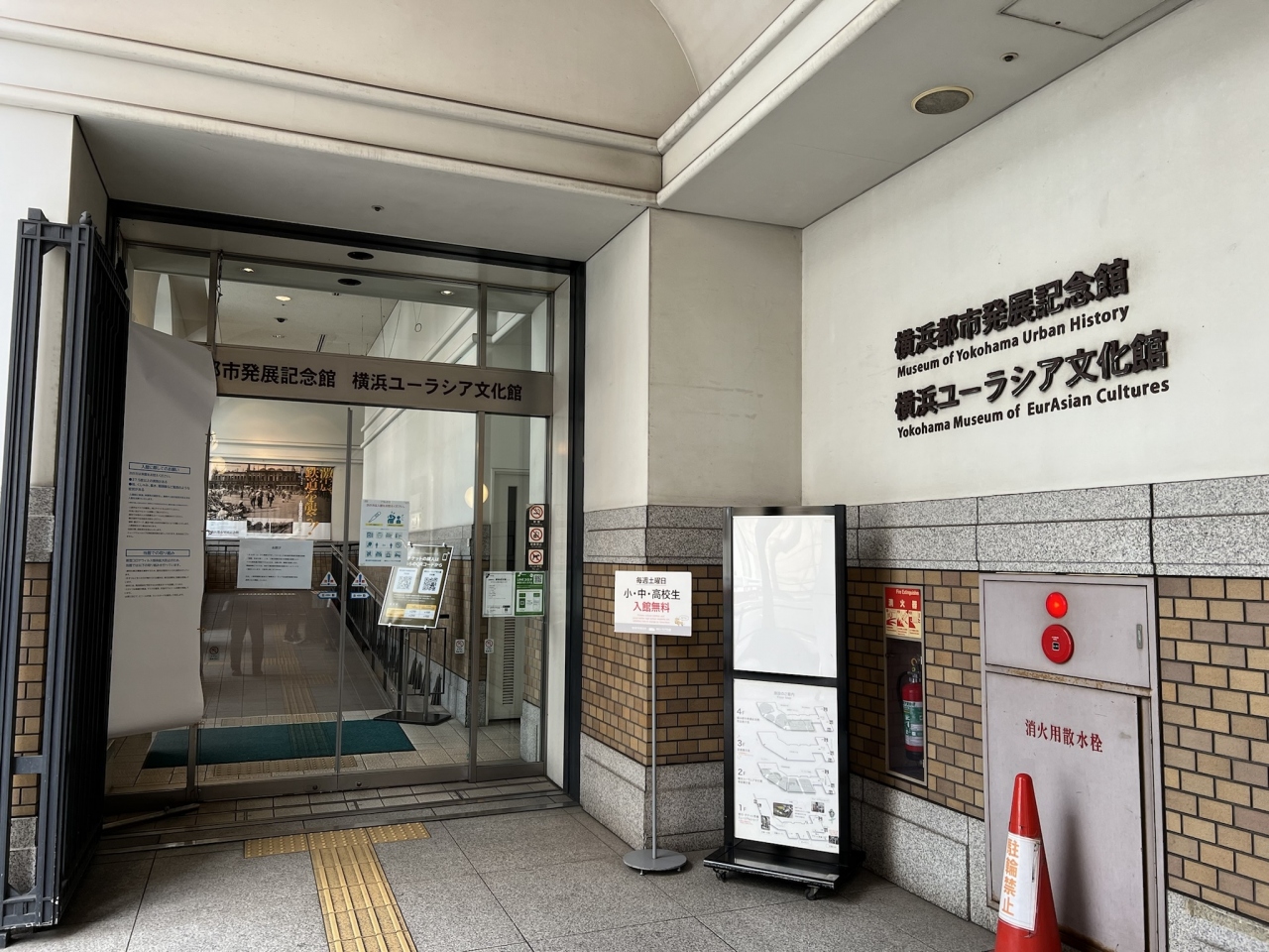 みなとみらい線の日本大通り駅、3番出口から地上に出たところに、この文化館の入口があります。入口には「横浜ユーラシア文化館」と「横浜都市発展記念館」の2つの表示があります。ユーラシア地域の歴史や文化を紹介する博物館で、観覧料(一般)は200円、ミュージアムショップには無料で入ることができます。