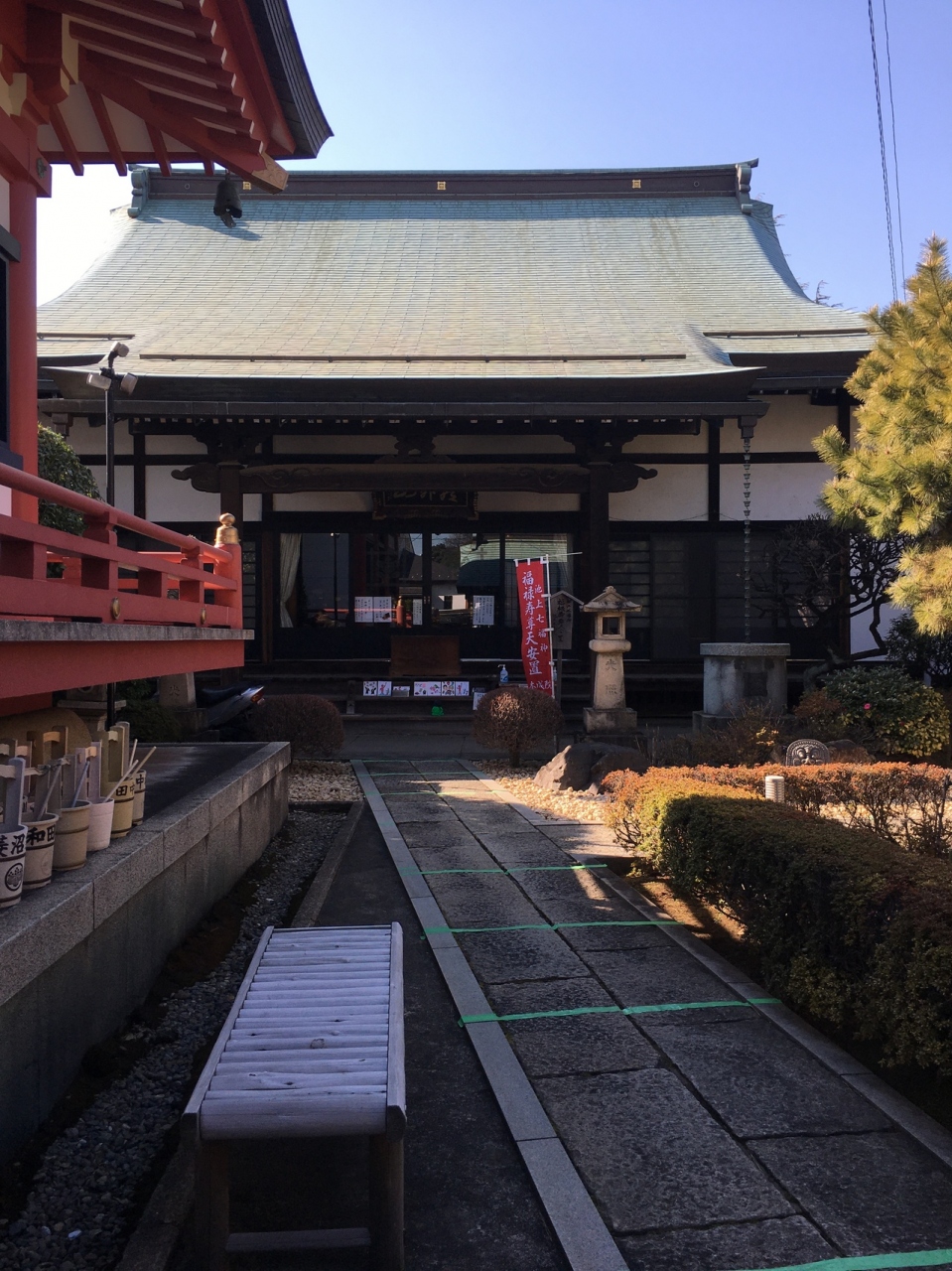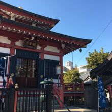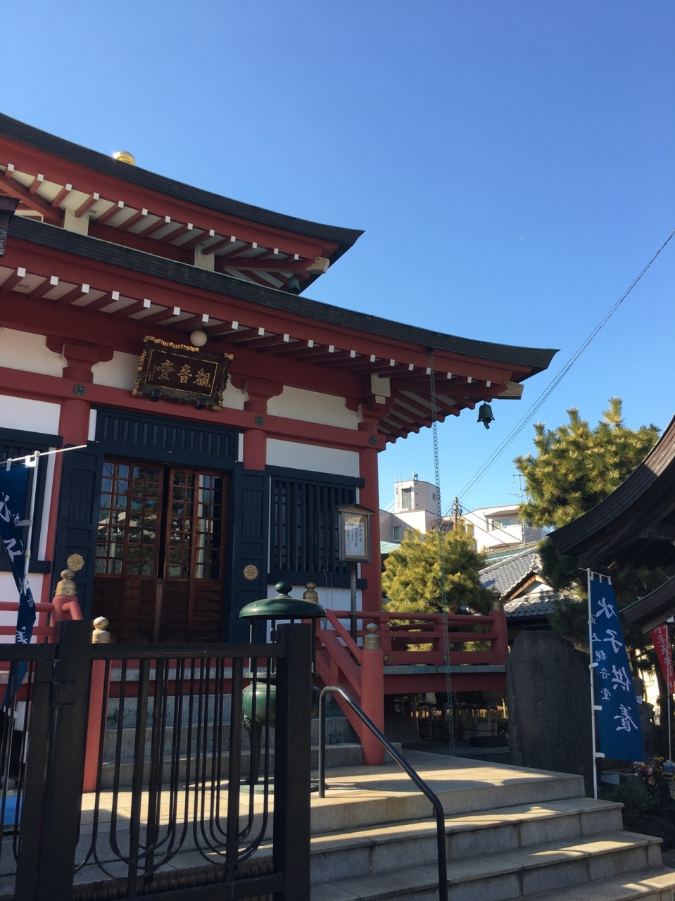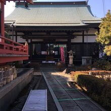 池上本門寺の寺がかたまった総門前にあり、木の門で、門を潜ると正面に本堂画あり狭い境内でした。本堂横には赤い色が目立つ観音堂が目立って建っていて、水子供養の青い旗が靡いていました。草木が整備された境内でした。
