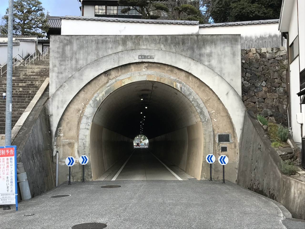 鶴形山隧道は、JR倉敷駅から南東の方向へ徒歩6分くらいの場所にあります。1926年に皇太子(後の昭和天皇)の行啓を記念して、訪問後に掘られたトンネルです。長さが100メートルくらいのトンネルで人も歩行が可能です。美観地区側のトンネルの入口に、その時の銅版が貼ってありました。昭和46~47年にかけて改修工事が行われています。
