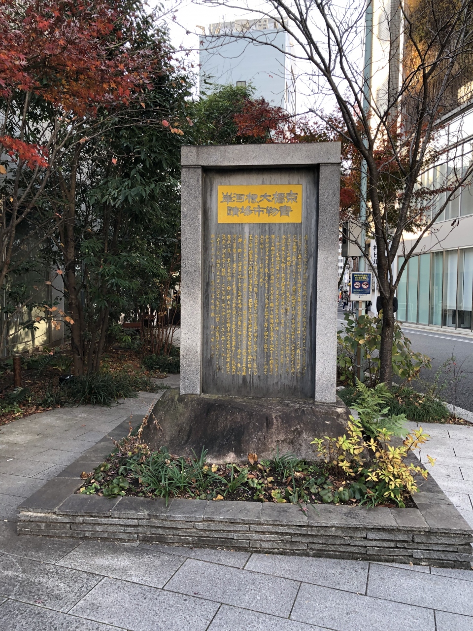 京橋の首都高の下、小公園のように整えられている場所にこの石碑は設置されています。刻まれている文字が黄色というのはちょっと珍しいかも。文字が小さく文章が長いので、