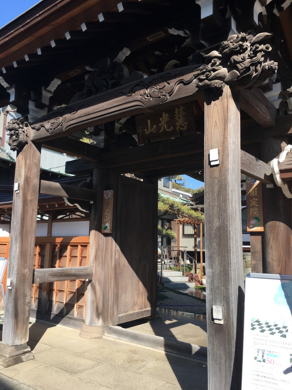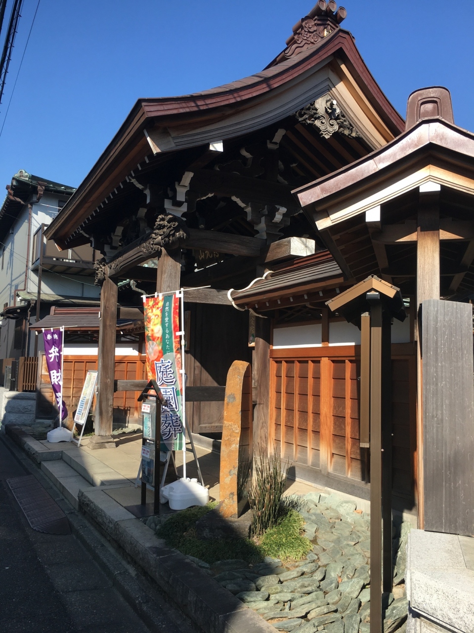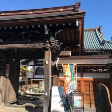 木で出来た門で、柱の上には年季がある獅子の彫刻がありました。境内は狭かったですが本堂が大きく敷地の半分以上を占めている感じでした。門前には寺のパンフレットと庭園葬の幟が靡いていました。側面に駐車場がありました。