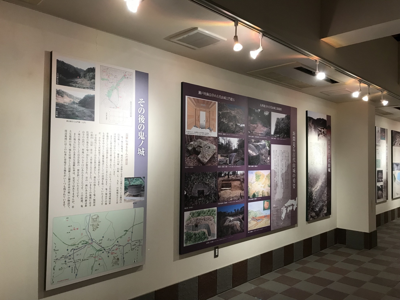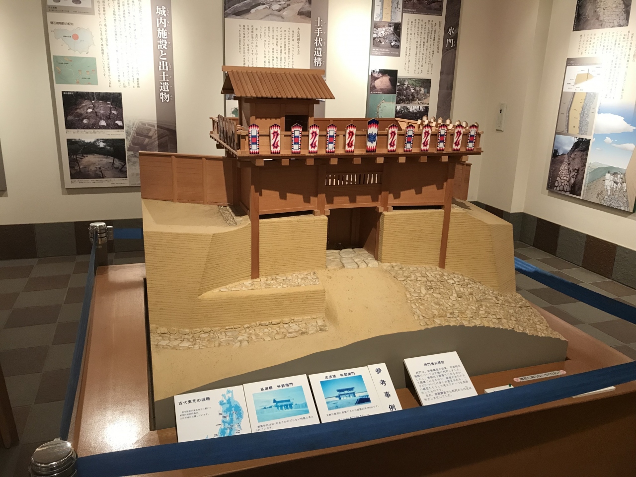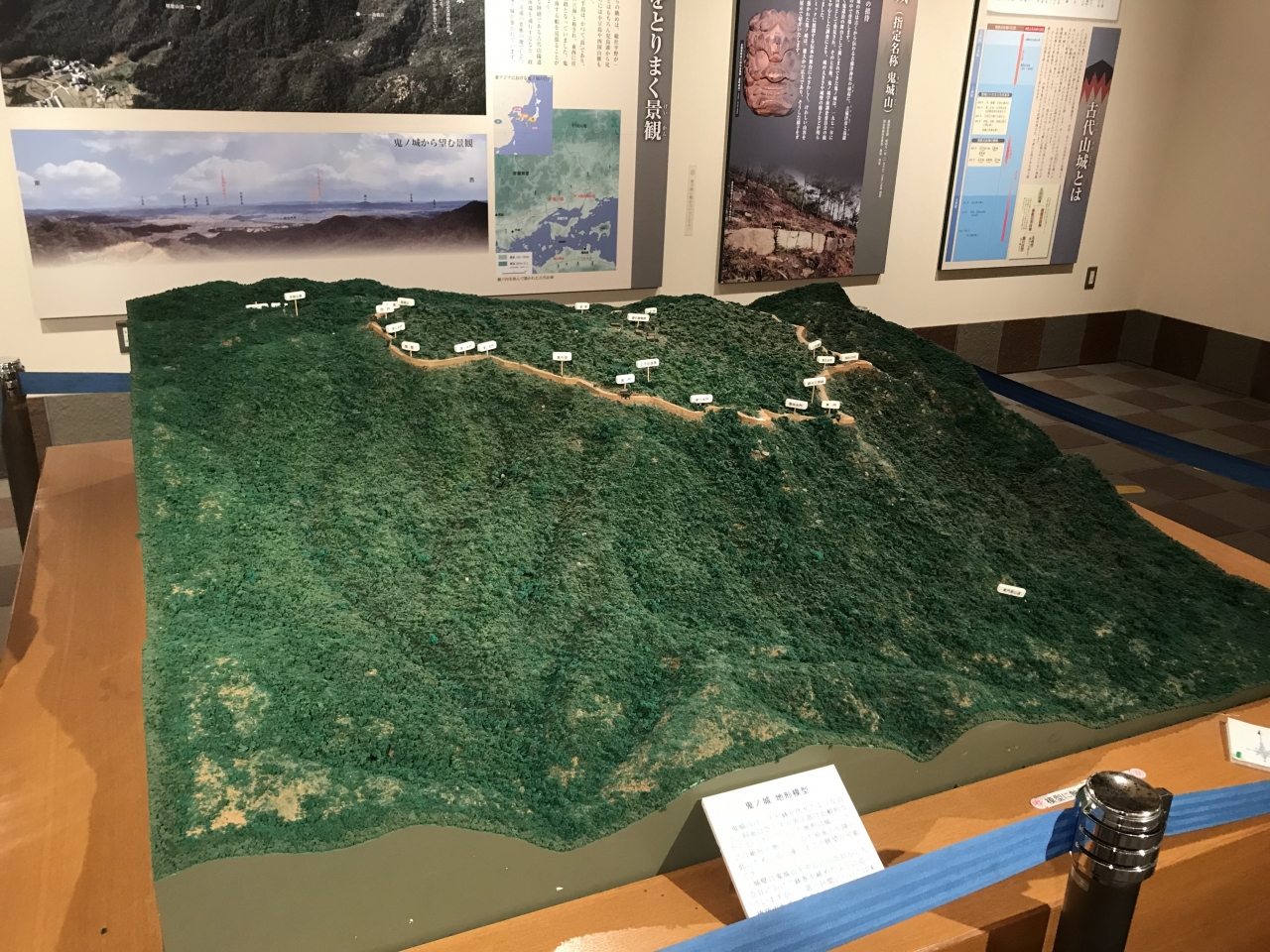鬼城山ビジターセンターは、観光用駐車場のある鬼ノ城入口にあります。鬼ノ城の概要について分かりやすく学習できる施設です。展示室には鬼ノ城の概要、古代山城についての解説のほかに、復元された西門の模型や地形のジオラマなどを展示していました。