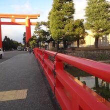 ずいぶん派手な橋だなあと思いながら、北の方に目をやると大きな鳥居が建っていました。