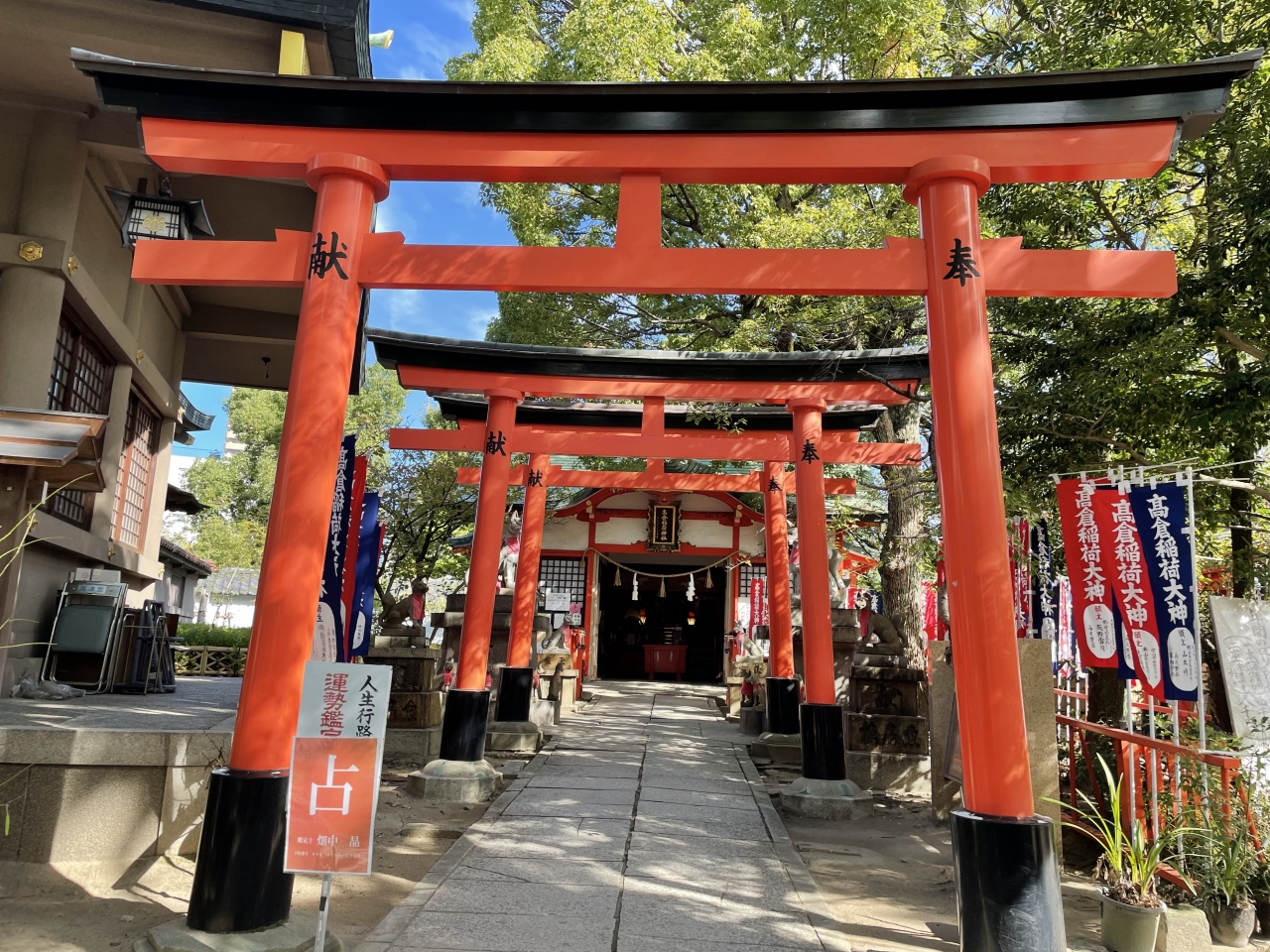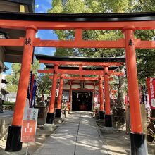 大阪・谷町のお寺が立ち密集する「寺町」を訪れた際に立ち寄りました。周辺地域よりも高台に位置していて、木々に囲まれ良い雰囲気です。古い歴史を持ち、仁徳天皇を主祭神としてお祀りしています。本殿の右奥にあり、赤い鳥居連なっているのですぐにわかります。稲荷神社なので狐の像が置かれています。