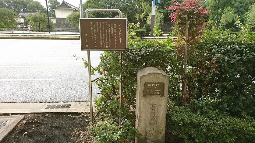 皇居東御苑の大手門入り口近くの内堀通りに記念碑と説明板が立っています。明治8年に東京市内で初めてニセアカシアの並木が植えられた場所なのだそうです。現代ではいたる所に並木道がありますが、ここが発祥の地だったのですね。近くを通る際には説明文のご一読をおすすめします。