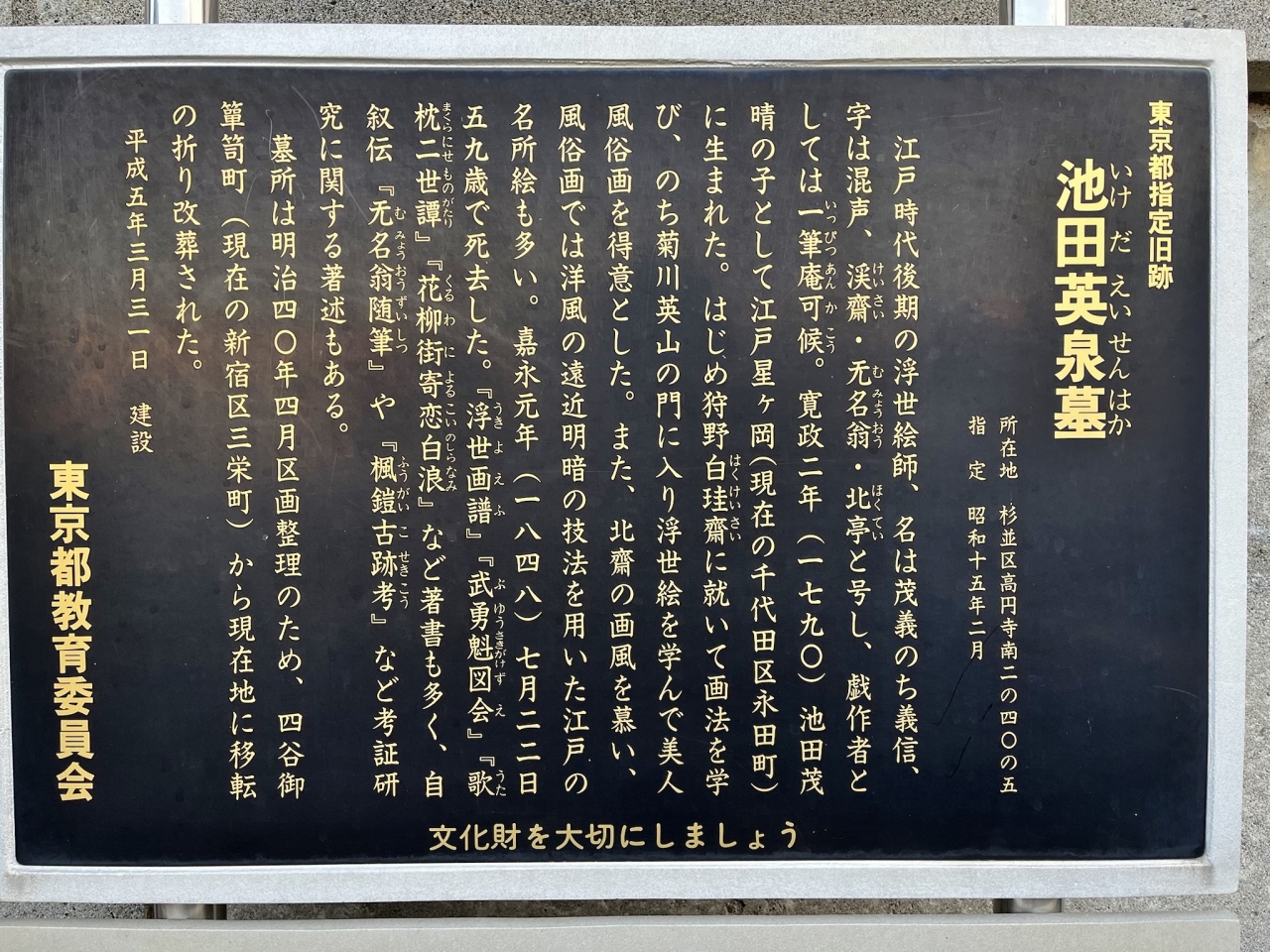 かの葛飾北斎とも交流があり美人画や春画で知られた作家らしいですが、なぜ高円寺にお墓があるかと言えば、もともと新宿の箪笥町麹町にあったものが区画整理のためこちらに移ったそうです