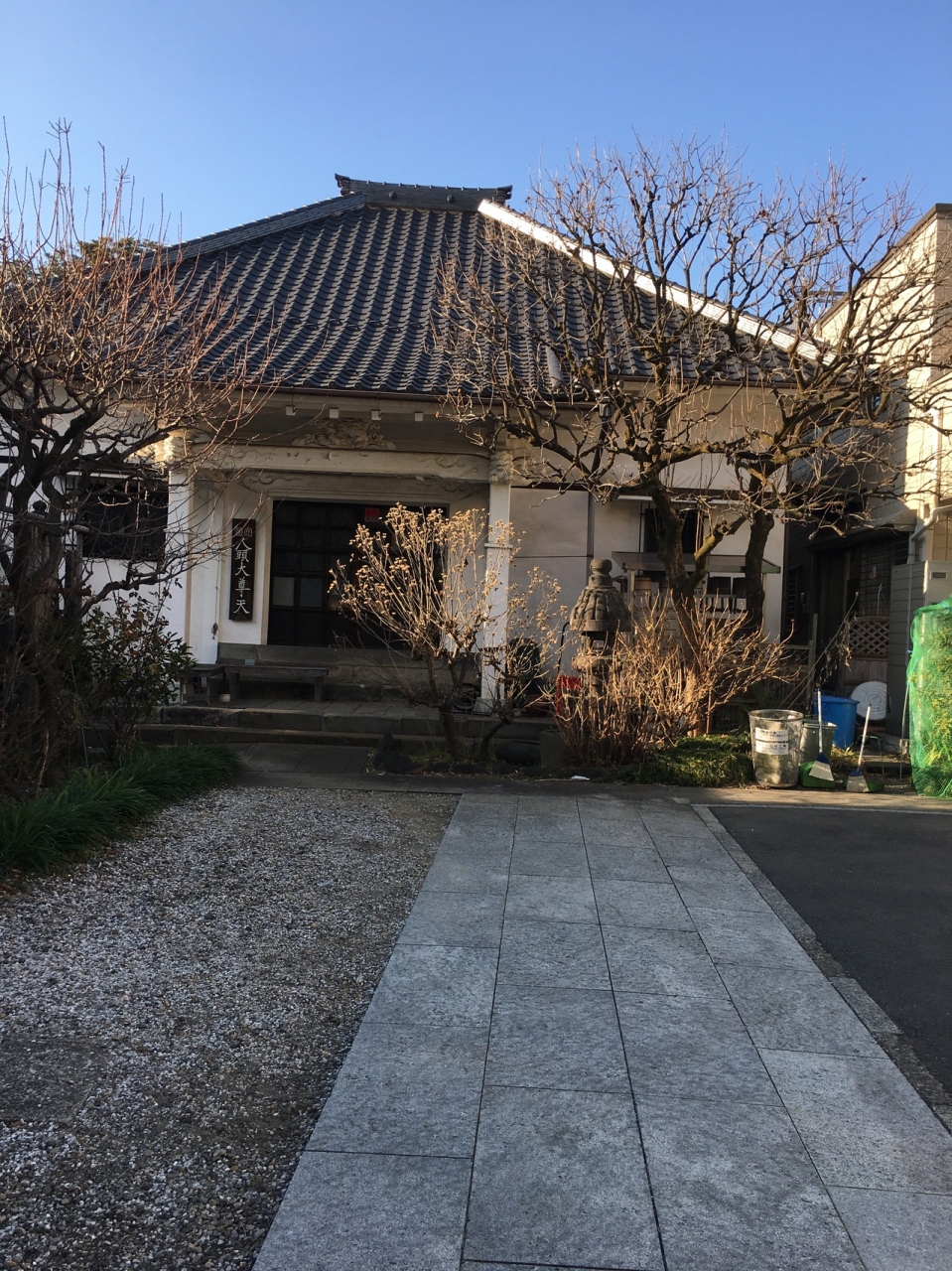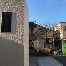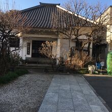坂道へと続く道沿いのお寺がかたまったエリアにあり、門は石の門でした。境内に入ると真っ正面には灯籠があり、その後方が白い正方形型の本堂で瓦屋根でした。地面はタイル張り、コンクリート、小石と3つに分かれていました。