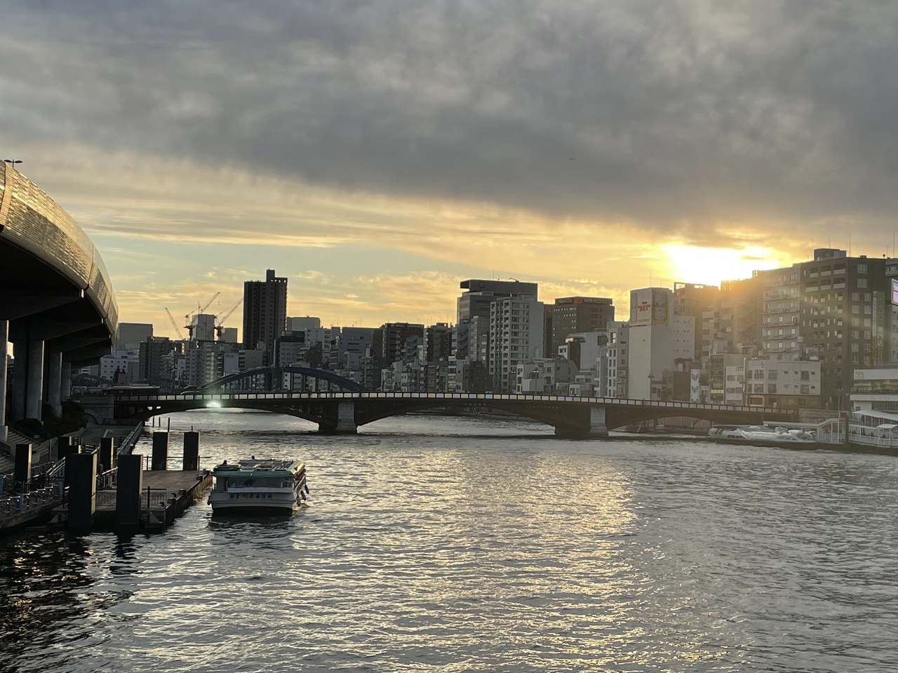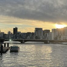 隅田川にかかる道路橋のひとつで日暮れ時にすみだリバーウオークより眺めました。浅草の中心部に一番近い橋で浅草側は渡ってすぐ雷門があります。近くには隅田川の水上バスの発着桟橋もあります。現在の橋は昭和初期のものです。